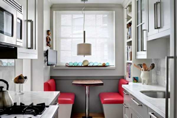 Ещё один вариант обустройства маленькой кухни, напоминающий аккуратное придорожное кафе, подойдёт для молодой пары. Белый цвет создаст эффект воздушности. У окна размещена полка с книгами — даже в одиночестве завтрак не покажется скучным. В качестве защиты от солнца использованы рулонные шторы. Низкая люстра, расположенная у самого стола, вечером поможет создать романтическое освещение.