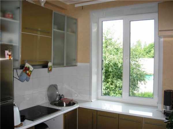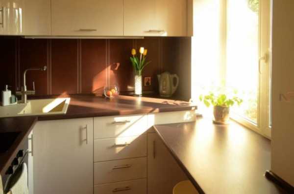 Использование подоконника в маленьких помещениях имеет большое распространение. Однако окно часто расположено ниже уровня столешницы. Рабочая поверхность необязательно должна иметь цельное полотно. Подоконник заменяется столешницей, идентичной основной. В результате получился широкий вместительный стол. Однако больше двоих человек на небольшой кухне все равно не сможет разместиться.
