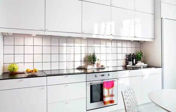 Небольшая кухня в белом цвете может быть очень романтичной и уютной. Чёрная столешница добавит интерьеру элегантности. Использование стены у окна позволит вместить большое число тумб для хранения посуды и продуктов.