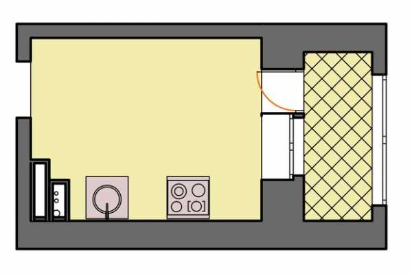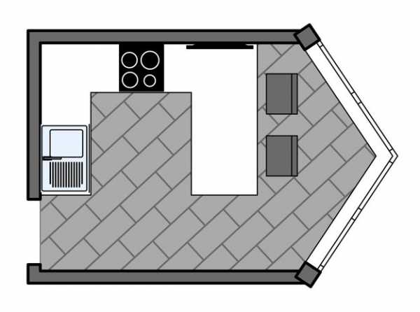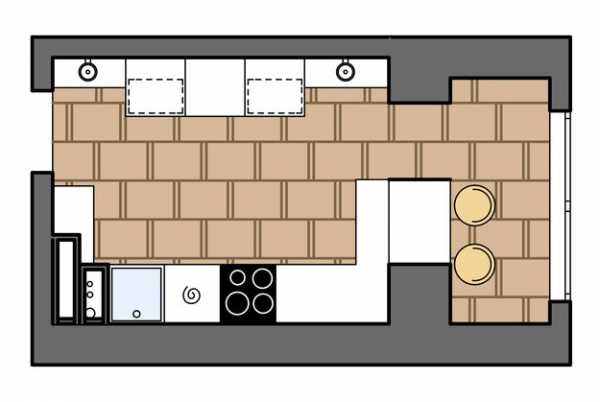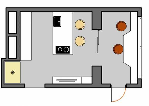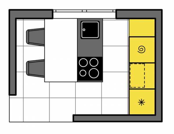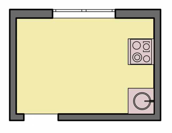Эта кухонная планировка обычно подходит для двушек или однокомнатных квартир, у которых площадь кухни не менее семи квадратных метров.