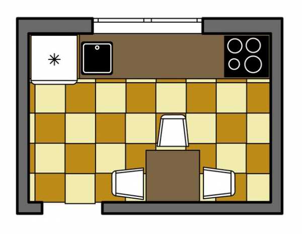 Рассмотрим вариант кухни с квадратурой не более 9 метров, в форме квадрата, а вход имеется напротив окна или же в стене, которая перпендикулярна окну.