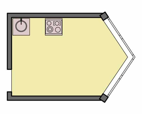 План очень похож на предыдущий, однако есть отличие во входе сбоку, а не напротив от окна-эркера. Такое расположение больше всего подходит для апартаментов, имеющих три комнаты, но при удачном расположении можно сделать и в квартирах с меньшей квадратурой. Этим самым можно освободить место для большого стола, перенести мойку и рабочую зону на сторону поменьше. Дополнительный уют внесет уютный диванчик, который удачно впишется у одной из стен.