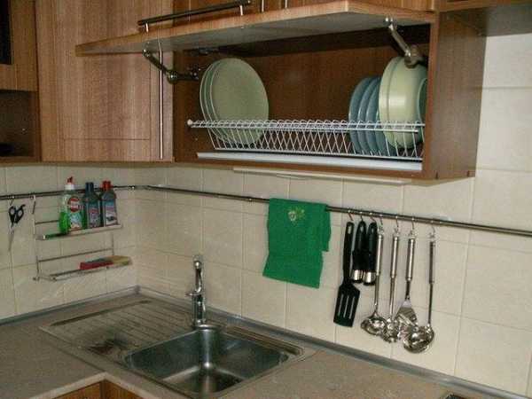 Для совсем крошечных помещений рекомендовано использовать каждый свободный сантиметр пространства. Можно заказать индивидуальную мебель высотой до потолка. Верхние полки не будут использоваться ежедневно, но появится место для хранения кухонной утвари.