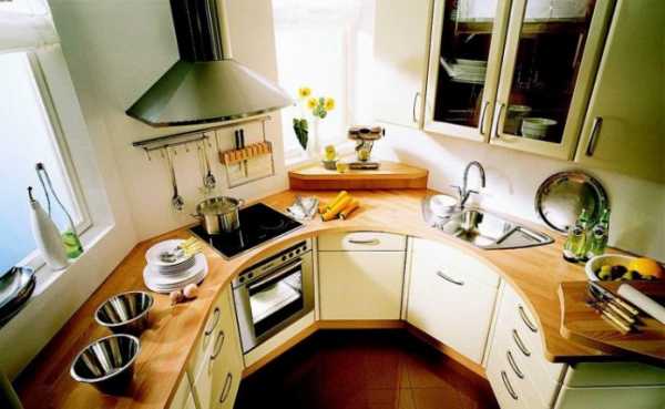 Рабочую поверхность в угловой кухне можно оформить полукруглой формы