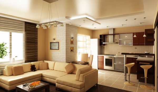 Довольно распространённым решением является объединение маленькой кухни и гостиной. В проёме располагают обеденный стол, который визуально разграничит пространство. В этом случае появится возможность более свободного размещения мебели и создание рабочей поверхности.