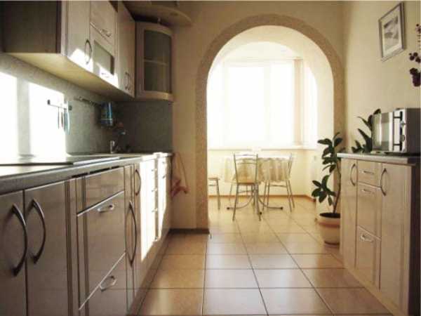 Если кухня имеет выход на балкон, два помещения можно объединить. В этом случае придётся позаботиться о добротном утеплении. Зона приготовления еды увеличивается, в ней с лёгкостью размещаются все необходимые бытовые приборы и системы хранения. Линия арки, полученной в результате демонтажа балконного проёма, повторяется по всему потолку.