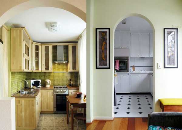 Также обратите внимание на кухонную дверь. Нередко дверь может отнимать существенную часть площади, загораживать проход и т.д. Есть несколько приёмов, которые помогут её «обезвредить». Самый радикальный метод — убрать дверь вообще. Вместо неё можно сделать красивую арку, или проявить фантазию и оформить дверной проём более вычурно.