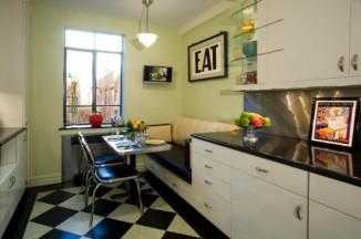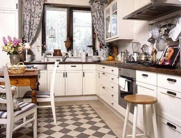 Если кухня выдержана в стиле начала 20 века, то уместны будут черные, белые и красные тона. Причем черно-красными или черно-белыми квадратами выкладывают пол.