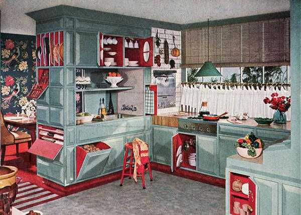 Для ретро-кухонь характерны такие цвета кухни и сочетания цветов, иногда совершенно непривычные: