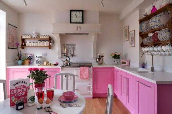 Если кухня в стиле 50-х годов, то возможен вариант сочетания мятного оттенка зеленого с белым или ярко-желтым. При этом мятной должна быть мебель. В это же время были модны оттенки розового, начиная от насыщенного яркого до нежного бледного. При этом розовым может быть как шкафы, так и стены.