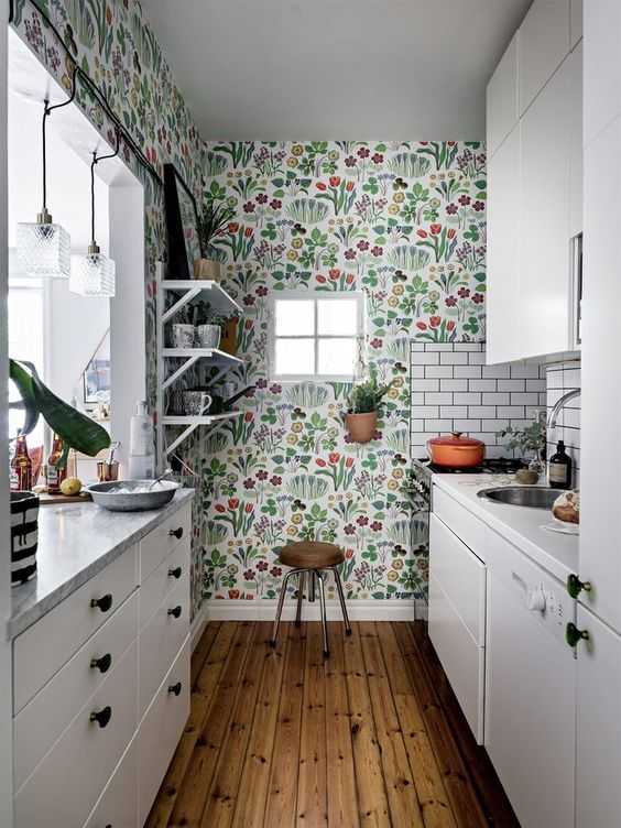 Обои с растительным орнаментом в интерьере кухни