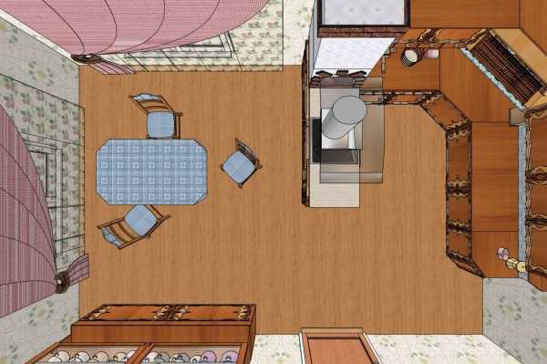 Для этого помещения подойдет и стиль 50-х годов. Тогда в зоне кухни будет традиционная плитка на полу и кухонном фартуке. Мебель может иметь розовые, голубые, красные глянцевые фасады. В зоне гостиной тяжелая деревянная мебель: комод, буфет, диван с деревянными ручками, ковер на полу, рабочий столик, этажерки.