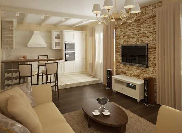 Дизайн интерьера гостиной, совмещённой с кухней в бежевых тонах