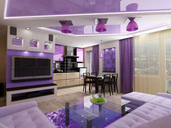 Зонировать помещение можно с помощью разноуровневого натяжного потолка или потолка из гипсокартона. Потолок над отдельными зонами может также отличаться по цвету и способу оформления.
