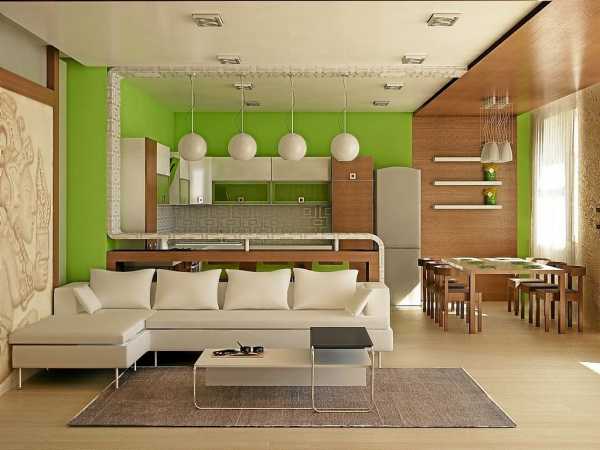Одним из простейших способов зрительного разделения независимых зон кухни и зала является различное цветовое оформление. При выборе цветов не стоит забывать о том, что гостиная и кухня должны быть выдержаны в определенном стиле, поэтому не стоит выбирать для оформления совмещенных помещений кардинально разные цвета. Лучшим решением будет выбор разных оттенков одной цветовой гаммы. Если вы решили выбрать для зала и кухни разные цвета, не забывайте об их грамотном сочетании.