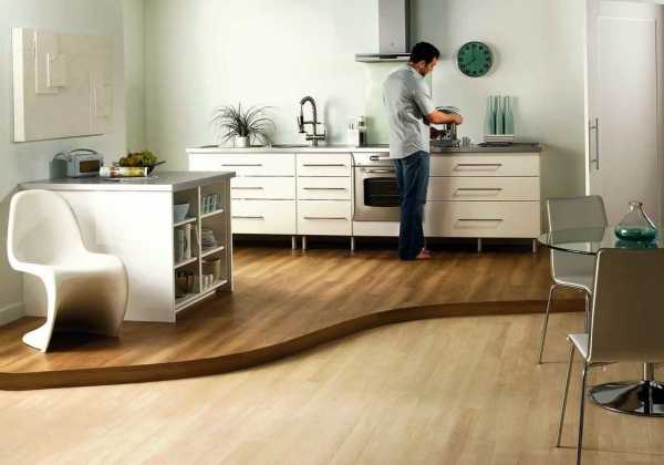 Если приподнять кухонную зону, сделав двухуровневые полы, удастся отделить ее от столовой. Тогда место приготовления пищи будет находиться на своеобразном подиуме. В этом случае необходимо подобрать подходящие друг к другу напольные покрытия. Но если в доме живут дети и пожилые люди то от такого зонирования лучше отказаться, так как оно будет слишком травматичным.