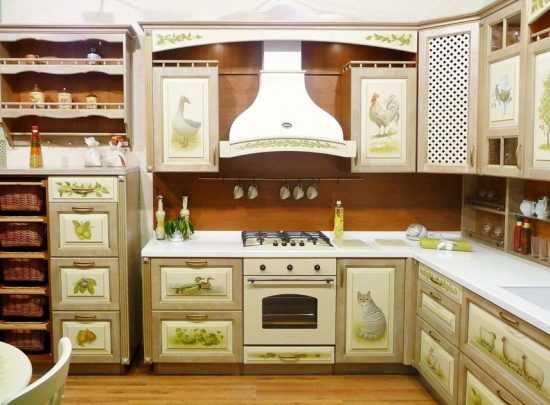 По уровню эстетичности с нанесением изображения на дверцы мебели можно сравнить лишь роспись кухонных фасадов. Это еще одна эксклюзивная технология декорирования гарнитуров в таких стилях, как классика, прованс, кантри, шебби шик, винтаж. Здесь более уместны рустикальные сюжеты, эскизные наброски.