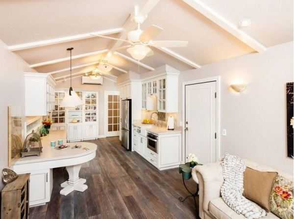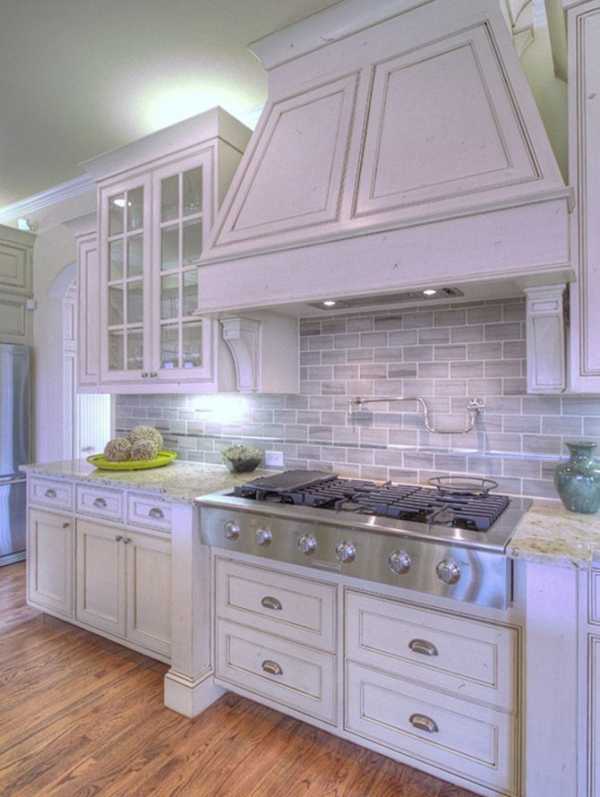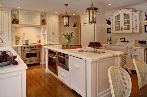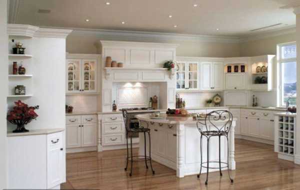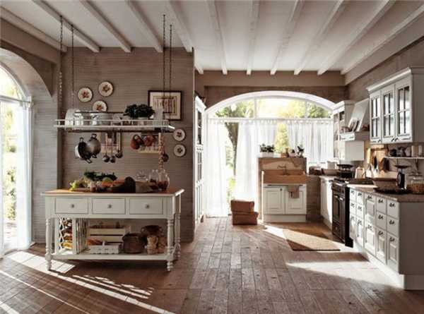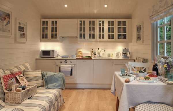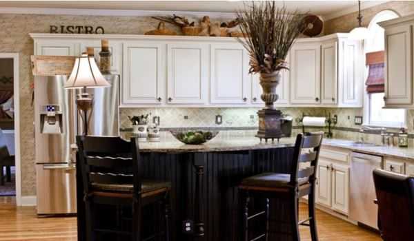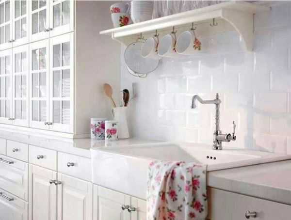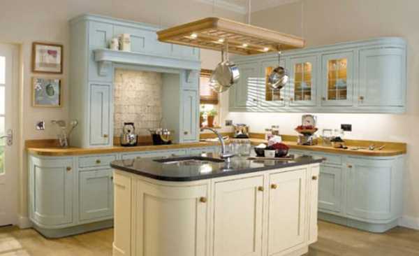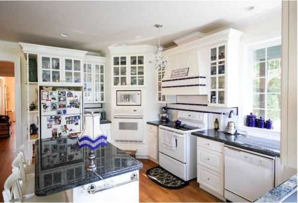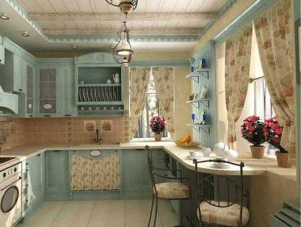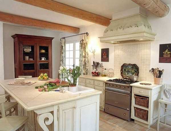 Данный стиль характеризуется наличием антикварных вещей и специально состаренных предметов. При оформлении таких помещений дизайнерами обычно используется один основной цвет, который присутствует в различных аксессуарах, текстильных изделиях и других элементах интерьера. Это может быть небесно-голубой, белый или молочный оттенок, придающий кухне красивый и романтичный вид.