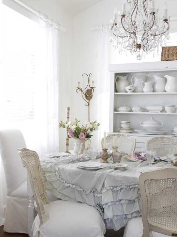 Главное, чтобы мебель была добротной. Украшенные резьбой и светлыми чехлами с цветочным принтом, деревянные стулья — отлично подойдут для шебби-кухни. Тоже касается и стола, хлопковые кружевные скатерти станут отличным украшением для него.