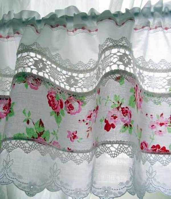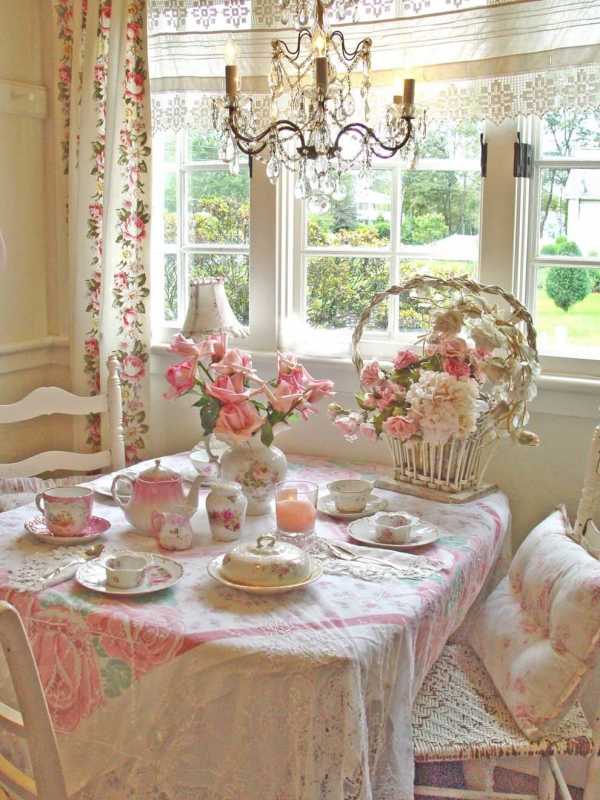 Как правило, здесь используется текстиль, имеющий нежные пастельные тона. Такие изделия обычно украшаются растительными цветочными мотивами, а также слегка заметной полоской или клеткой. Салфетки и полотенца могут быть сшиты из тонкого гипюра, имеющего светлый оттенок, а скатерти и покрывала украшаются всевозможными рюшами и бантами. Шторы и занавески в данном интерьере обычно декорируются нарядными ламбрекенами, каскадами и красивой драпировкой.