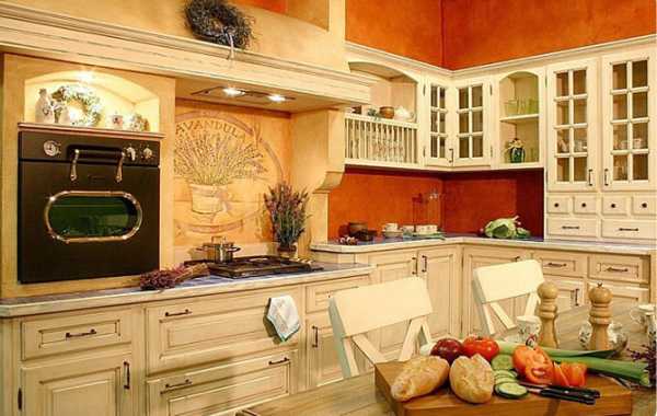 Обычно кухонные гарнитуры изготавливают из натуральной древесины, фасады окрашивают в светлых тонах, делая их матовыми. На мебельных поверхностях непременно должны быть легкие потертости.