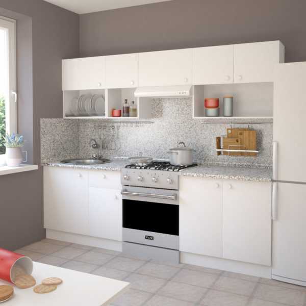 Белая кухонная мебель с верхними шкафчиками до потолка