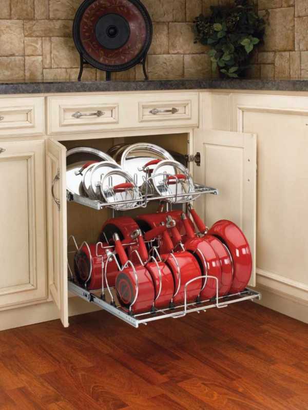 Замените обычные полочки на выдвижную систему. Небольшие полочки для мелочей размещают как на стене, так и на внутренней стороне фасада. Для крышек смастерите перекладину и прикрепите ее на дверцу или стену. Вещи, которыми вы пользуетесь редко, уберите на полки, размещенные под потолком. Вариантов много, придумывайте свои.