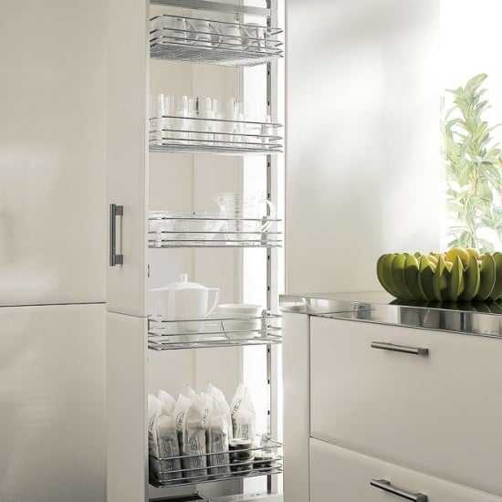 - В высоких выдвижных шкафчиках лучше размещать сыпучие продукты, бутылки.