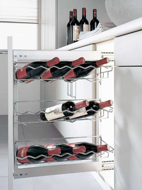 - бутылочницу можно разместить в узком пространстве между тумбочками, снабдив выдвижным механизмом.