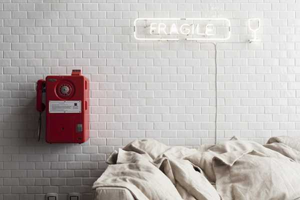 Стены первого этажа полностью облицованы простой белой керамической плиткой, даже в зоне гостиной. В сочетании с таксофоном, неоновыми надписями и светильником, похожим на уличный фонарь (см. также предыдущее фото ), это создает образ «улицы в интерьере», добавляя квартире иронии.