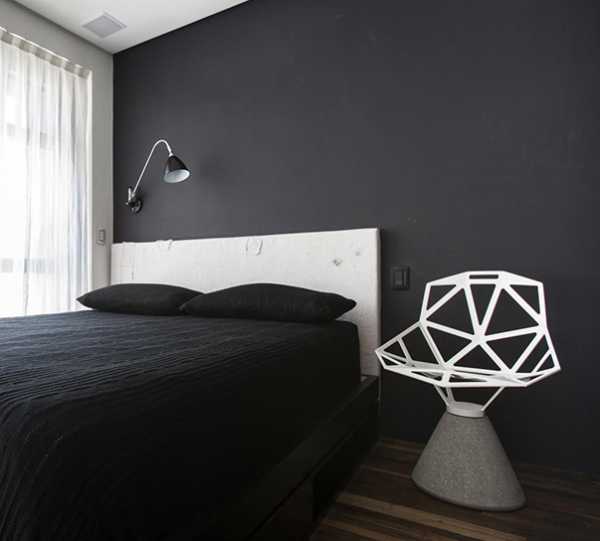 На этом фото — второй этаж. На контрасте с первым он решен очень графично: черные стены, черная кровать со светлым изголовьем. Нарочито мужской интерьер, что и понятно.