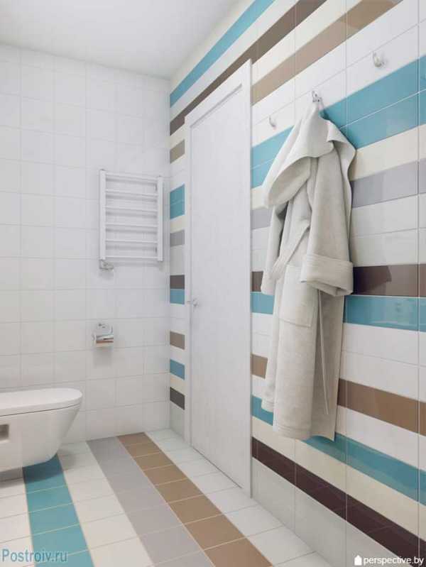 Так как ванная комната в таких квартирах также имеет маленький размер, то для ее отделки используют плиточные элементы светлых оттенков. Для придания помещению объема можно разбавить дизайн плиточками – «кабанчик» другого тона. На полу выкладывают плитку приятного оттенка беж.