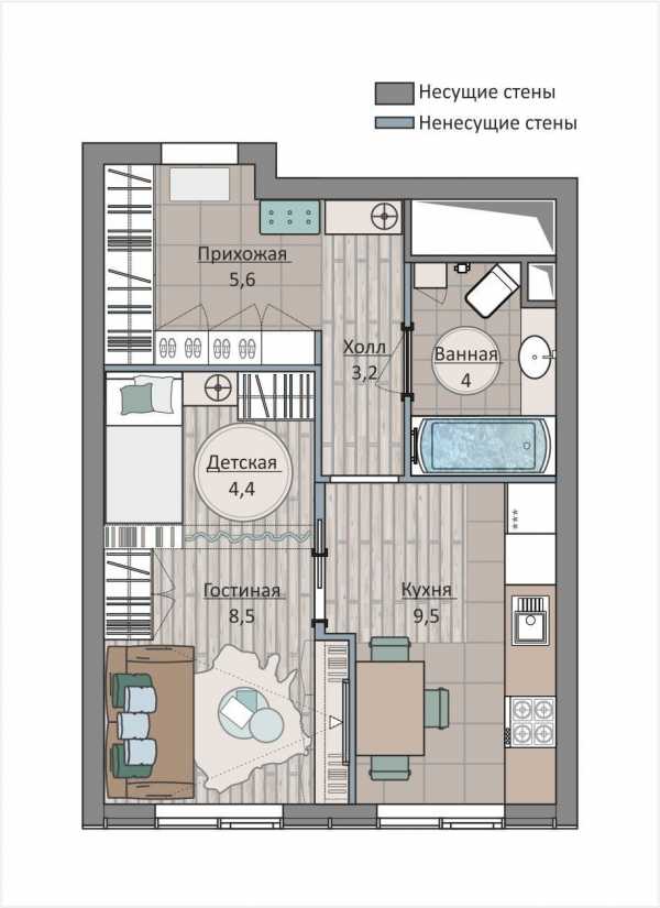 Для молодой семьи с ребенком потребуется минимальная перепланировка. Мы выстроим простенок для ниши в холле, чтобы дополнить вместительные встроенные шкафы узкой обувницей. Также изменим геометрию стены между гостиной и кухней, благодаря встроенному комоду под телевизор. Диван раскладывающийся и выполняет функцию спального места для родителей.