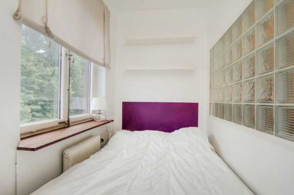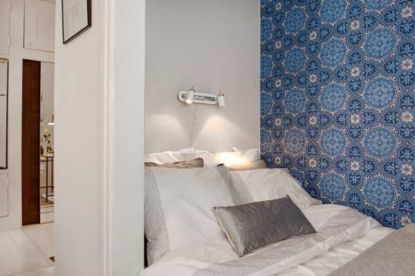Любопытно оформлена зона спальни, здесь она является частью основной комнаты, но в то же время отделена перегородкой. Примечательной особенностью является стена, оклеенная яркими синими обоями с калейдоскопическим узором.