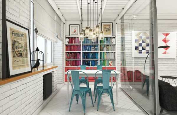 В обеденной зоне для книг и документов предусмотрен вместительный стеллаж, на кухне подвесные шкафы увеличенной высоты позволят убрать всю необходимую посуду и долговременные запасы круп.