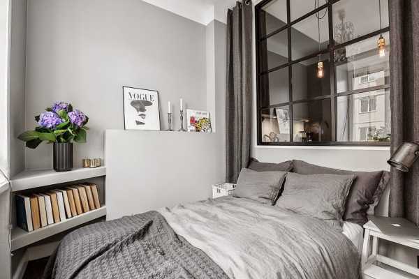 Перепланировку начнем с демонтажа перегородки между жилой комнатой и кухней. При входе в объединенное пространство создадим небольшую нишу, которая позволит оборудовать спальню с полноценной кроватью, тумбочкой и книжным шкафом для домашней библиотеки. Сюда поступает естественное освещение, но при желании можно задернуть текстильную занавеску и уединиться.