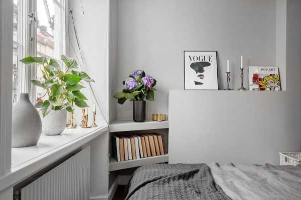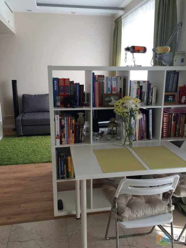 Главная задача при декорировании апартаментов в 36 м² — не перегрузить и не захламить пространство, превратив его в сарай. Для размещения всех аксессуаров достаточно возведенного открытого стеллажа.