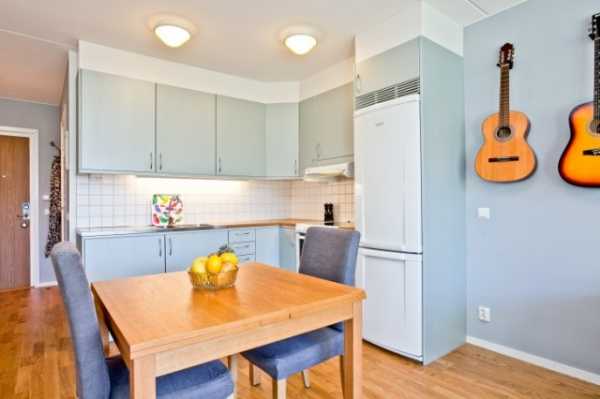 Кухня базируется при входе в квартиру, и дизайн мебели выполнен в стиле минимализм, который четко вписывается в сдержанных скандинавских образ этого жилья.