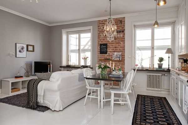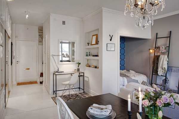 Для малогабаритных жилплощадей целесообразно использовать светлые тона в отделке. Дизайн квартиры оформляют нейтральными красками, выкрашивая стеновые и потолочные поверхности в белоснежный тон.
