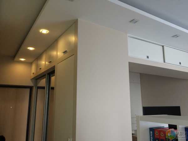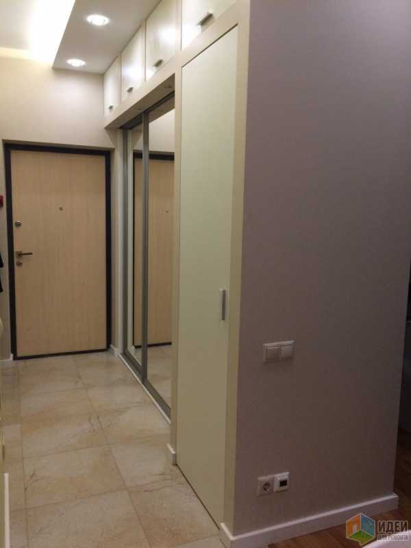 При входе расположен вместительный шкаф, больше напоминающий гардеробную, благодаря встроенной в нишу конструкции. Фасады дверей зеркальные, и становятся почти незаметными, если шкаф закрыть.