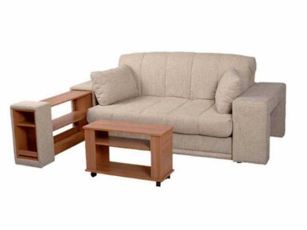 Мебель для малогабаритных жилплощадей подбирается компактная. Зачастую привычные предметы заменяются раскладными или модульными конструкциями, которые легко передвигаются, изменяя геометрию комнаты. Очень удобен диван с выдвижной столешницей.