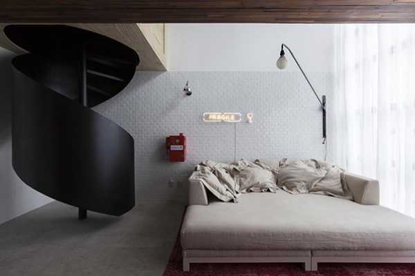 Все основное помещение оформлено достаточно просто и непритязательно. Так, на фоне белых стен установлен черный диван, а на полу постелен ярко-зеленый ковер с длинным ворсом, который уравновешивает монохромную гамму. Но самым интересным приемом является, несомненно, спальня, помещенная в импровизированном алькове. Ее от гостиной отделяет портьера, а от кухни – перегородка из стеклоблоков.