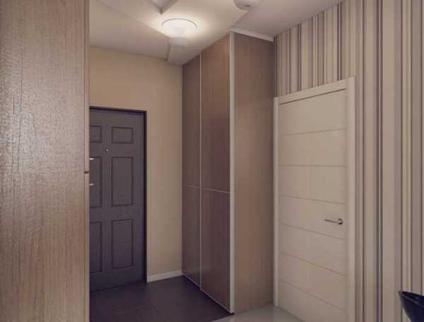 Зеркало без рамки и вертикальные полосы на противоположной стене создают эффект расширенного пространства. Этому способствуют оригинальные светильники в форме шляпы гриба, и темно-коричневая плитка при входе. Дверь в ванную цвета слоновой кости создаёт контраст с окружающими предметами и выгодно подчёркивает зону перехода из коридора в кухню или гостиную.