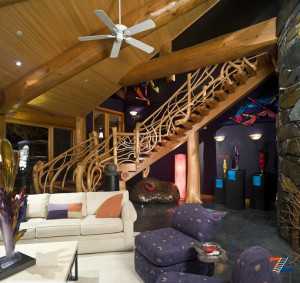 - В гостиной, оформленной в деревенском стиле, лестницу на второй этаж можно изготовить из светлых пород дерева, а ступени сделать в форме расколотого пополам полена. Выглядит такая лестница очень эффектно.