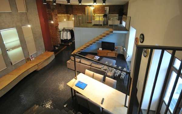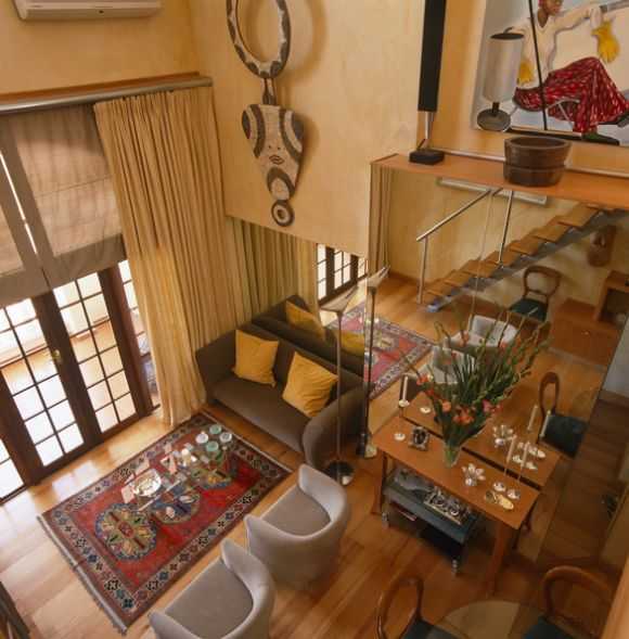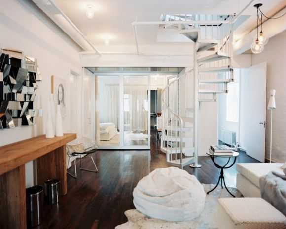 Лестница без перил, соединяющая спальню с гостиной. Выглядит эффектно, но о безопасности говорить не приходится.