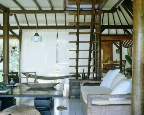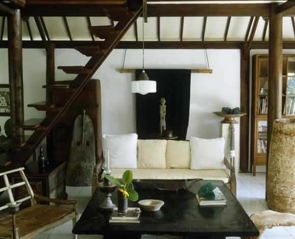 А на соседнем фото затейливая конструкция на второй этаж в стиле русских сказок помещена в комнату в стиле фьюжн, то есть смешение стилей. Кажущийся хаос на самом деле – кропотливая работа дизайнера по интерьерам, который подобрал текстиль, мебель, подсветку и все остальное в идеальном соотношении. И опять элементы пролета связывают собой предметы обстановки: прутковые ограждения исполняют дуэт с деревянными потолочными перекрытиями.