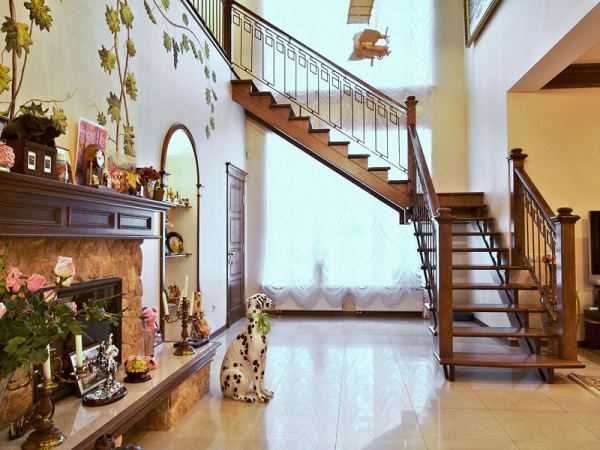 Другое исполнение кантри – натуральный камень. Нарочито грубый, неотесанный. Прекрасны каменные ступени и созвучные им плиты камина, грубый каменный пол, но яркий тканый коврик на нем. Убранство пролета может включать ковку и простые железные прутья вместо балясин. И, конечно же, цветная керамика на ступенях и такая же в облицовке камина и на кухонном «фартуке». А если лестница стоит в холле, то мозаичный пол как продолжение мозаичных ступеней – верх совершенства. Ах да, цветы, живые букеты сыграют заключительный аккорд в этом поистине лучшем интерьере – кантри.