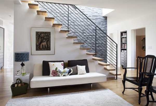 - Лестничные конструкции открытого типа реально и визуально не разделяют пространство, сохраняя целостность комнаты для приема гостей. Это может быть очень полезно для создания современных стилей интерьера, для которых более приемлем простор.