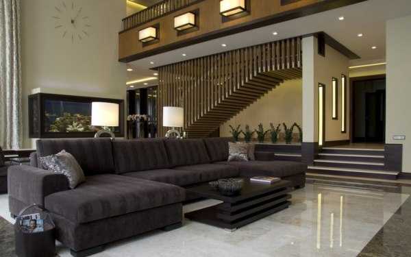 Дизайн гостиной с лестницей можно подчеркнуть с помощью освещения. При отсутствии верхнего света, важно спроектировать освещение ступеней лестницы. Если основной свет в доме приглушенный, то лестницу «заливают» более ярким светом, и наоборот.