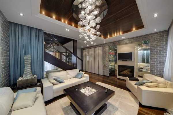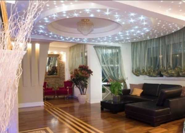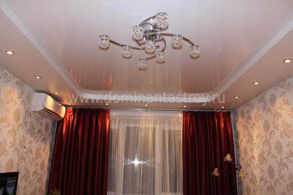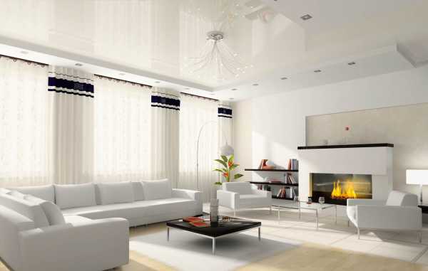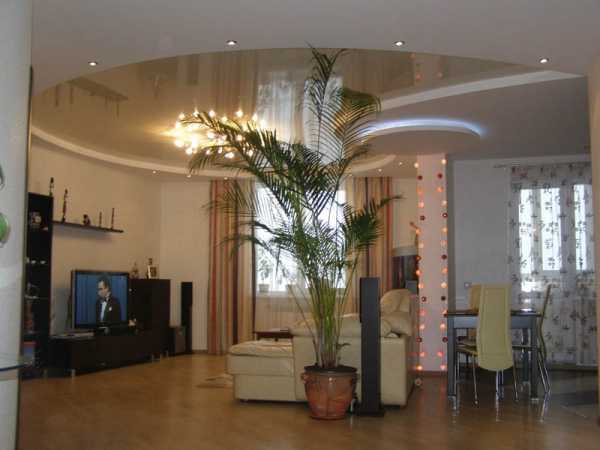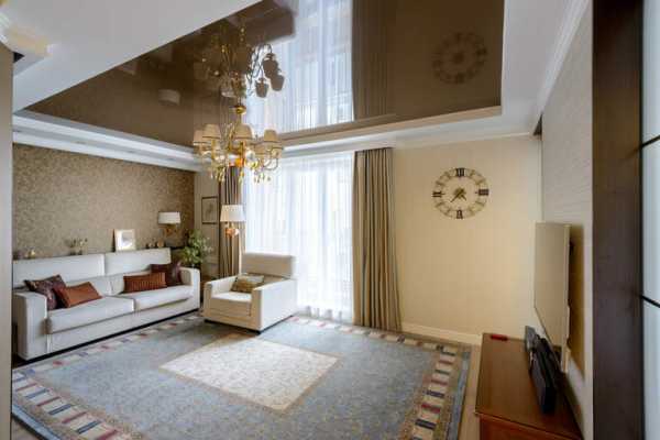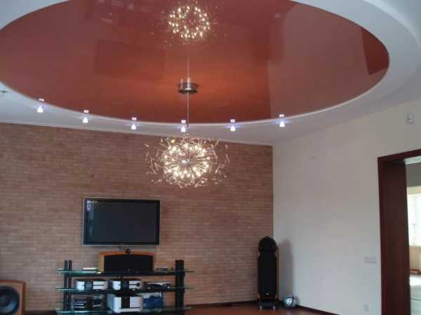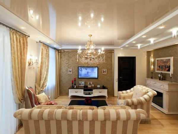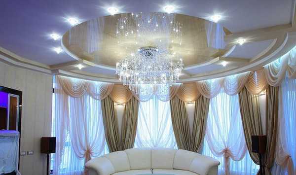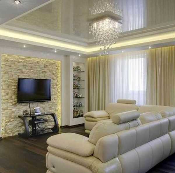 Фото натяжных потолков в зале с люстрой и светильниками — лучшие варианты в интерьере